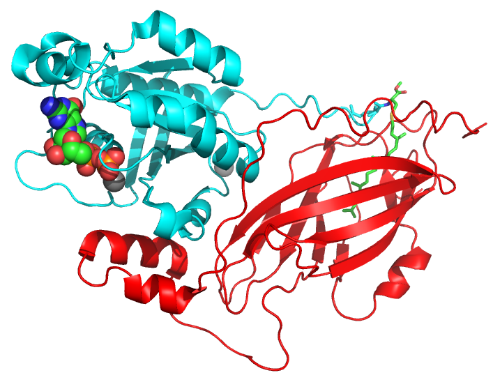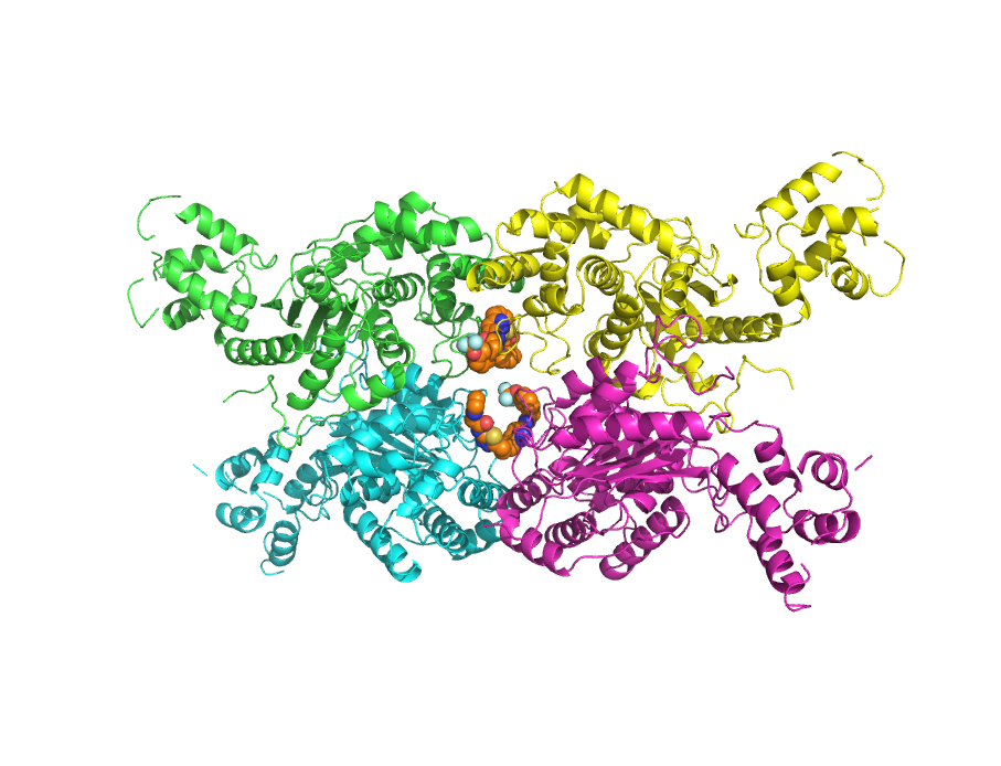 We have been focusing on understanding the signaling regulation of key metabolic enzymes that are responsible for the “glutamine addiction” exhibited by cancer cells as well as virus-infected cells undergoing the “Warburg effect”, and in the development of small molecule inhibitors targeting these enzymes as drug candidates. Below is a crystal structure of glutaminase bound to an allosteric inhibitor, CB-839.